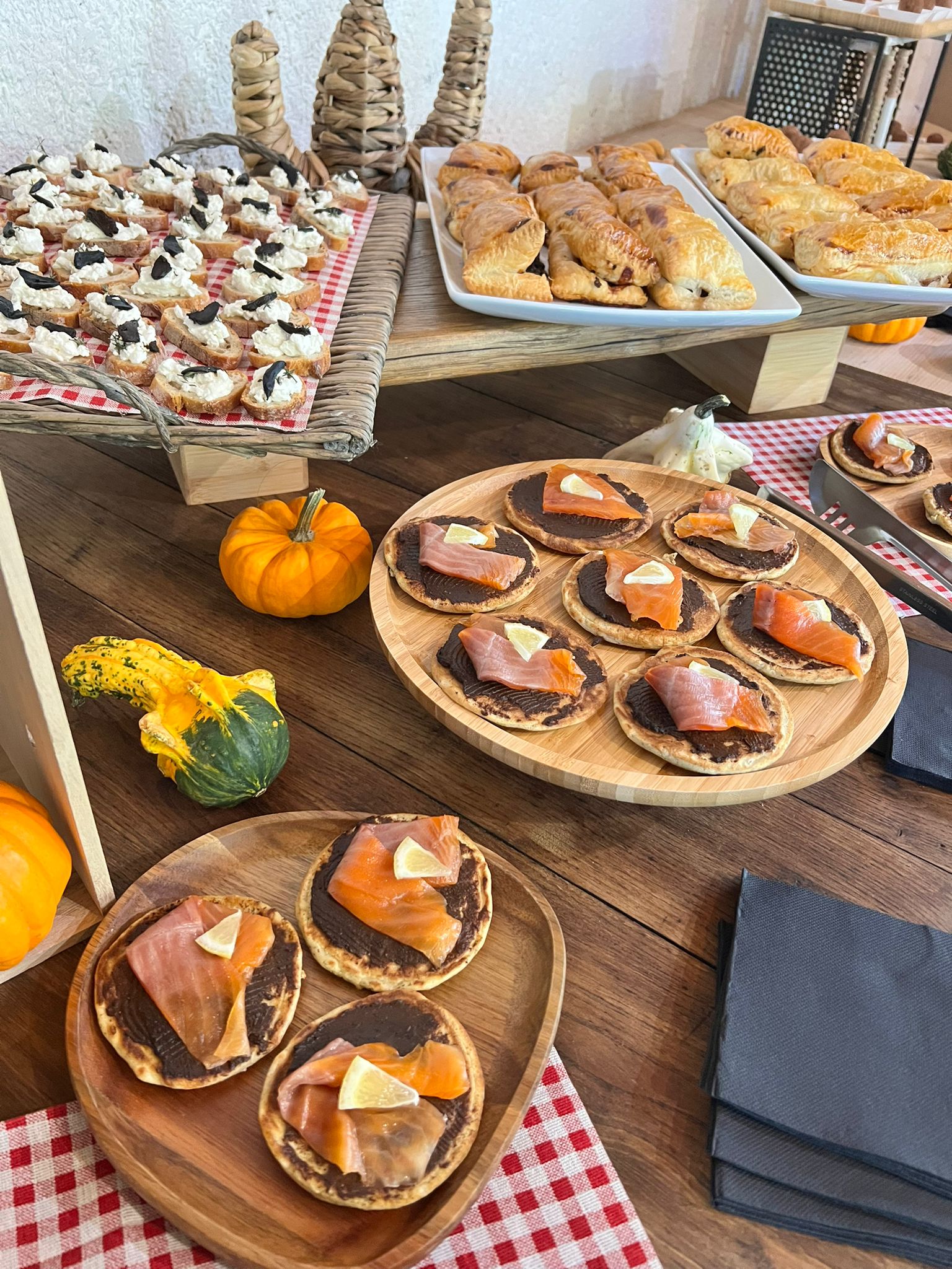 La cheffe compose un assortiment de bouchées salées et sucrées, selon la saison, son inspiration du moment et l’équilibre du groupe.